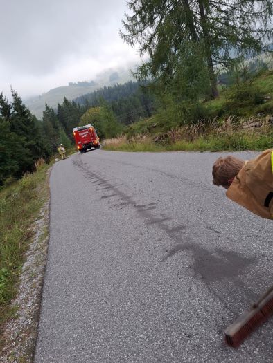 Die ausgerückte Mannschaft der FF Strobl übernahm das Binden der ausgetreten Flüssigkeit und die Reinigung der Fahrbahn von Kehre 8 bis zum Parkplatz Zentralkasse.
